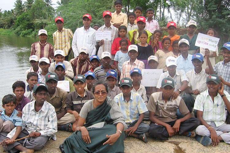 At that time I was in Brahan team. We had blue caps and Padma amma was my team in-charge. On the first day the camp started at 11 o’clock . Chitra akka explained the importance of our river Thamirabhrani and how the river was now threatened by “ahaya thamarai” (the water hyacinth weed). It was a new thing for us to know the weed consumes more water and reduces the path-way of the river. We also discussed what are the ways to reduce the weed growth. Even now I remember talking about the chemical way of using some herbicides. It is one option to reduce the weed in water bodies, but we don’t know the side effects of this method. We discussed other methods also and participated in a physical clearance that was done using big Hitachi excavator.